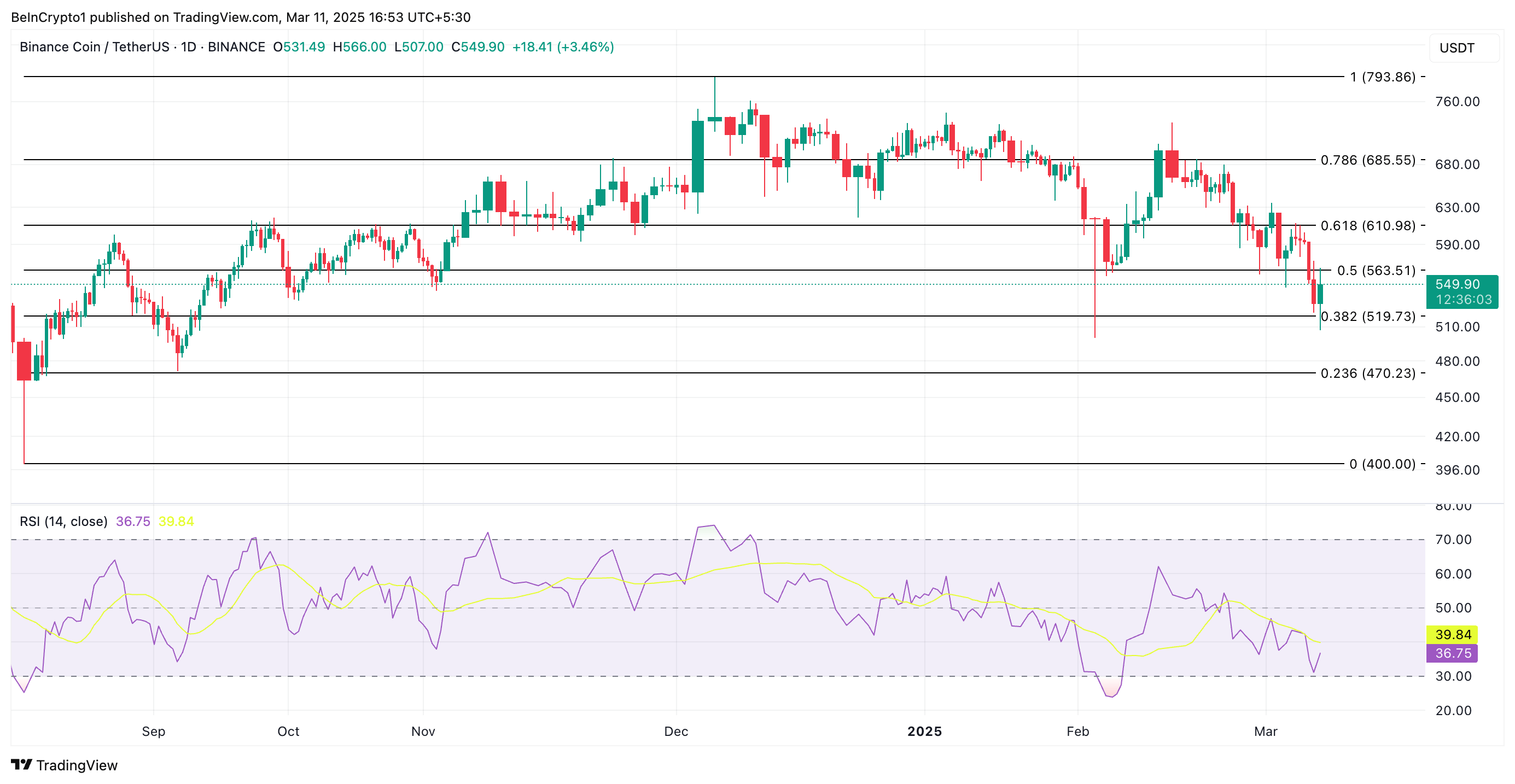 Com um RSI de 36,75, BNB está em tendência de baixa, mas ainda não atingiu a zona de sobrevenda. Isso sugere que a pressão vendedora ainda domina, mas uma reversão ou mais quedas dependerão das condições do mercado.