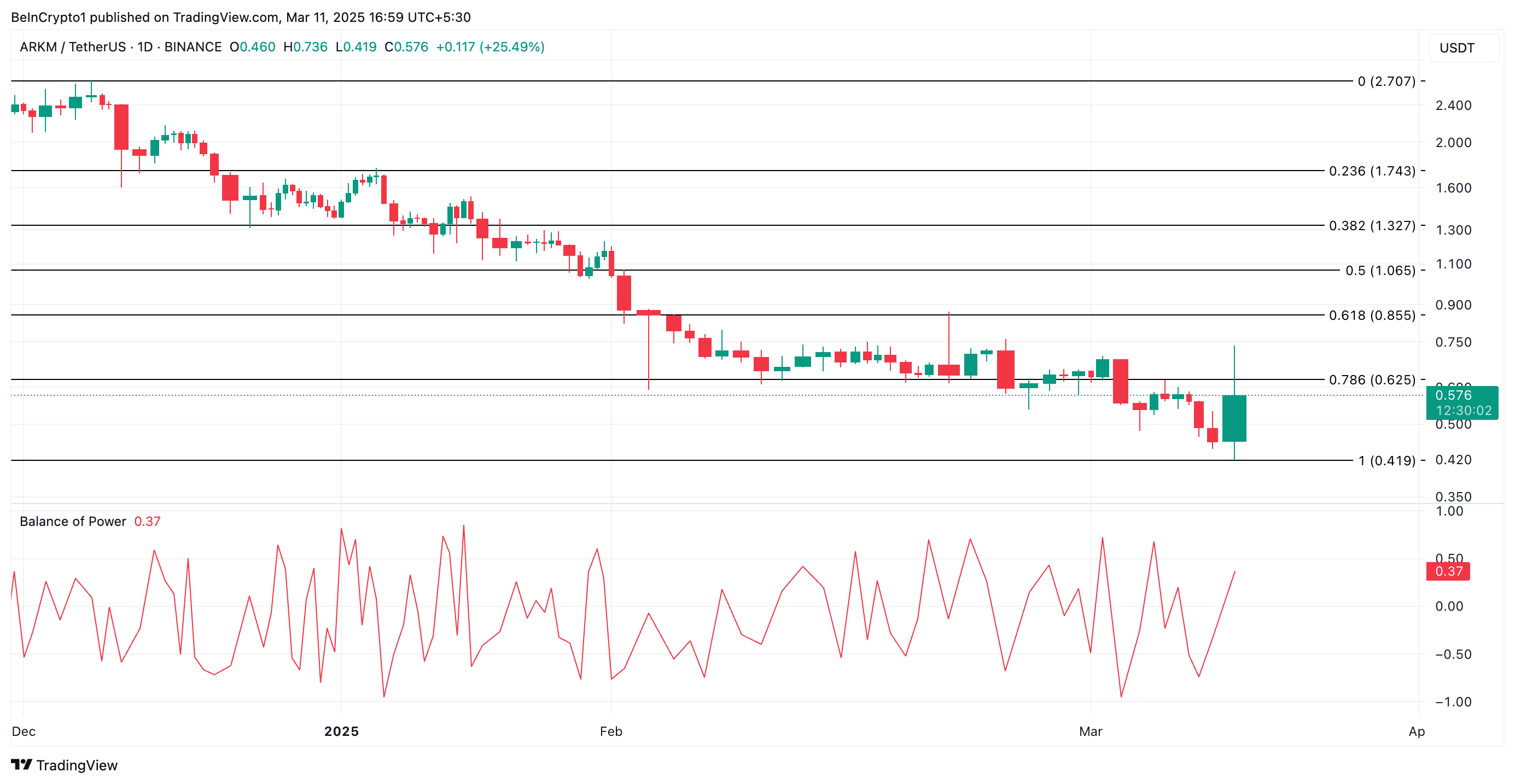 ARKM contrariou a tendência de queda do mercado, registrando um aumento de 10% nas últimas 24 horas. Durante as primeiras horas da sessão asiática de terça-feira, a altcoin foi negociada brevemente em sua máxima de sete dias de US$ 0,73 antes de corrigir para baixo.