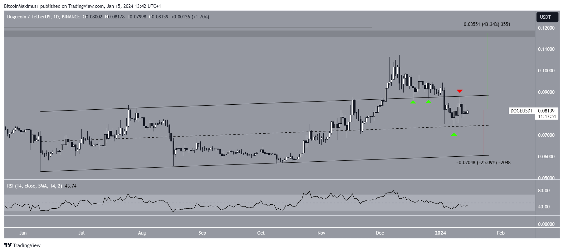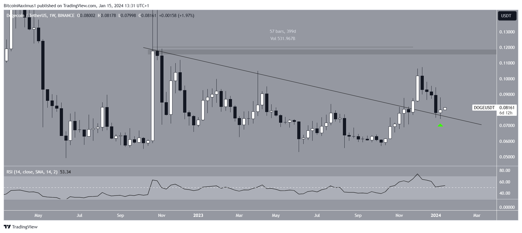 A análise técnica do gráfico semanal mostra que a Dogecoin caiu abaixo de uma linha de tendência de baixa em outubro de 2022. A queda levou a uma mínima em junho de 2023, com seu preço subindo desde então.