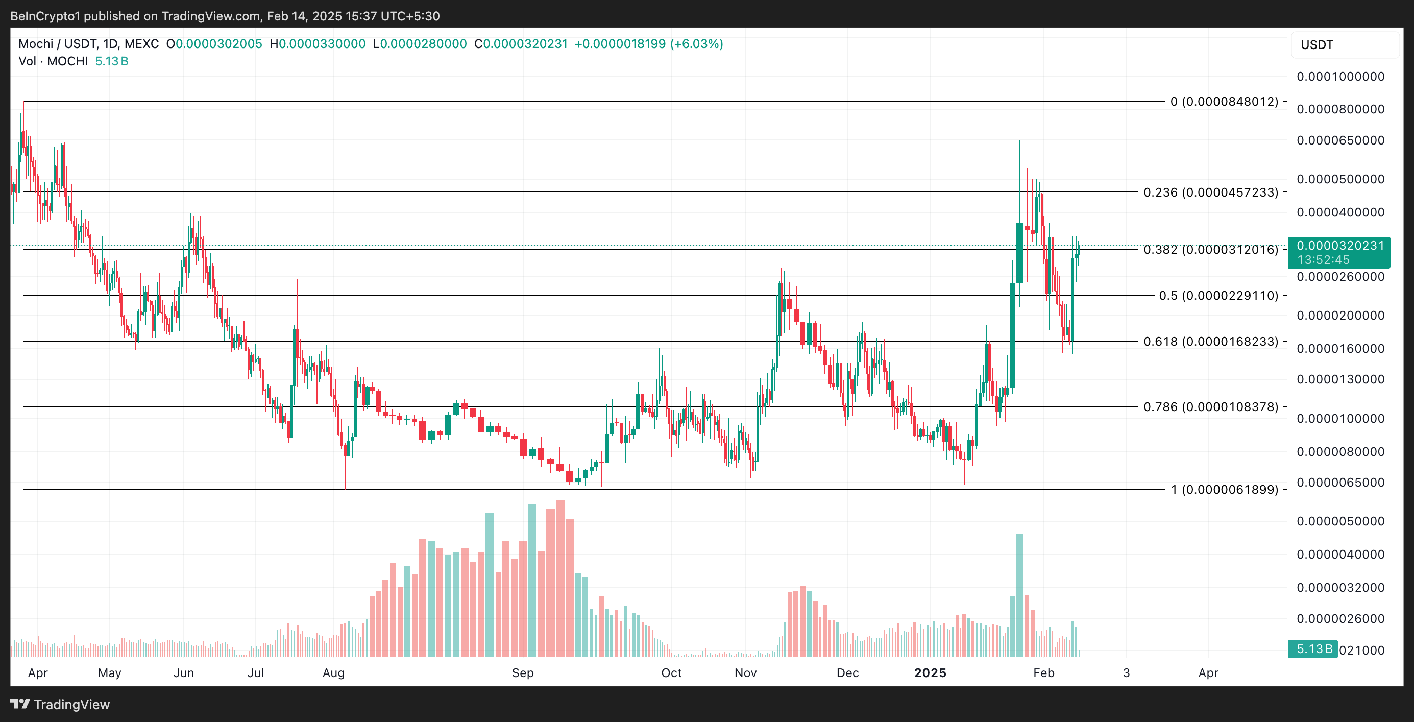 A MOCHI é outra altcoin em destaque hoje (14). A altcoin Base atualmente está sendo negociada a US$ 0,000032, e subiu 17% no último dia. No entanto, esse rali pode ser de curta duração. Embora seu preço tenha aumentado, o volume de negociação da MOCHI caiu 37% nas últimas 24 horas.