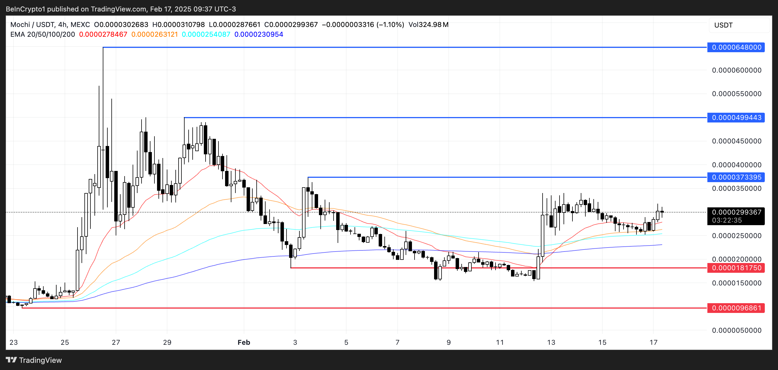 Um cruzamento dourado se formou há quatro dias, com as linhas de EMA de curto prazo ainda acima das de longo prazo. Se o impulso continuar, a MOCHI pode testar a resistência em US$ 0,000037 em breve. Um rompimento pode levá-la a US$ 0,000049, e se a pressão de compra permanecer forte, pode até alcançar US$ 0,000064.