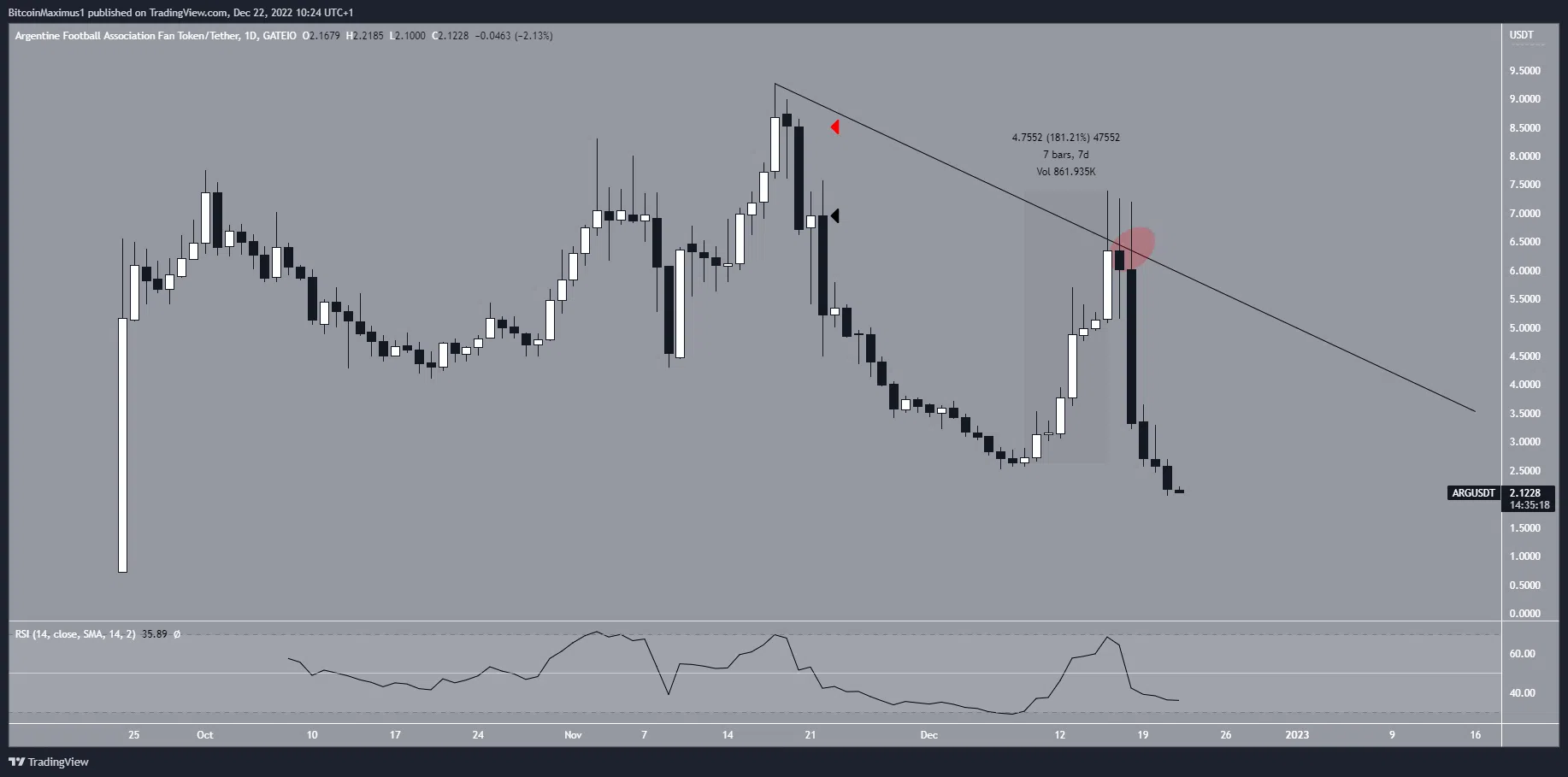 No entanto, embora Argentina e Lionel Messi tenham sido coroados campeões mundiais em 18 de dezembro, o fan token ARG caiu logo depois, validando a inclinação da linha de resistência (círculo vermelho). Isso provavelmente ocorreu quando os detentores de fan tokens sacaram e também fizeram com que o RSI diário caísse abaixo de 50, um sinal de uma tendência de baixa.