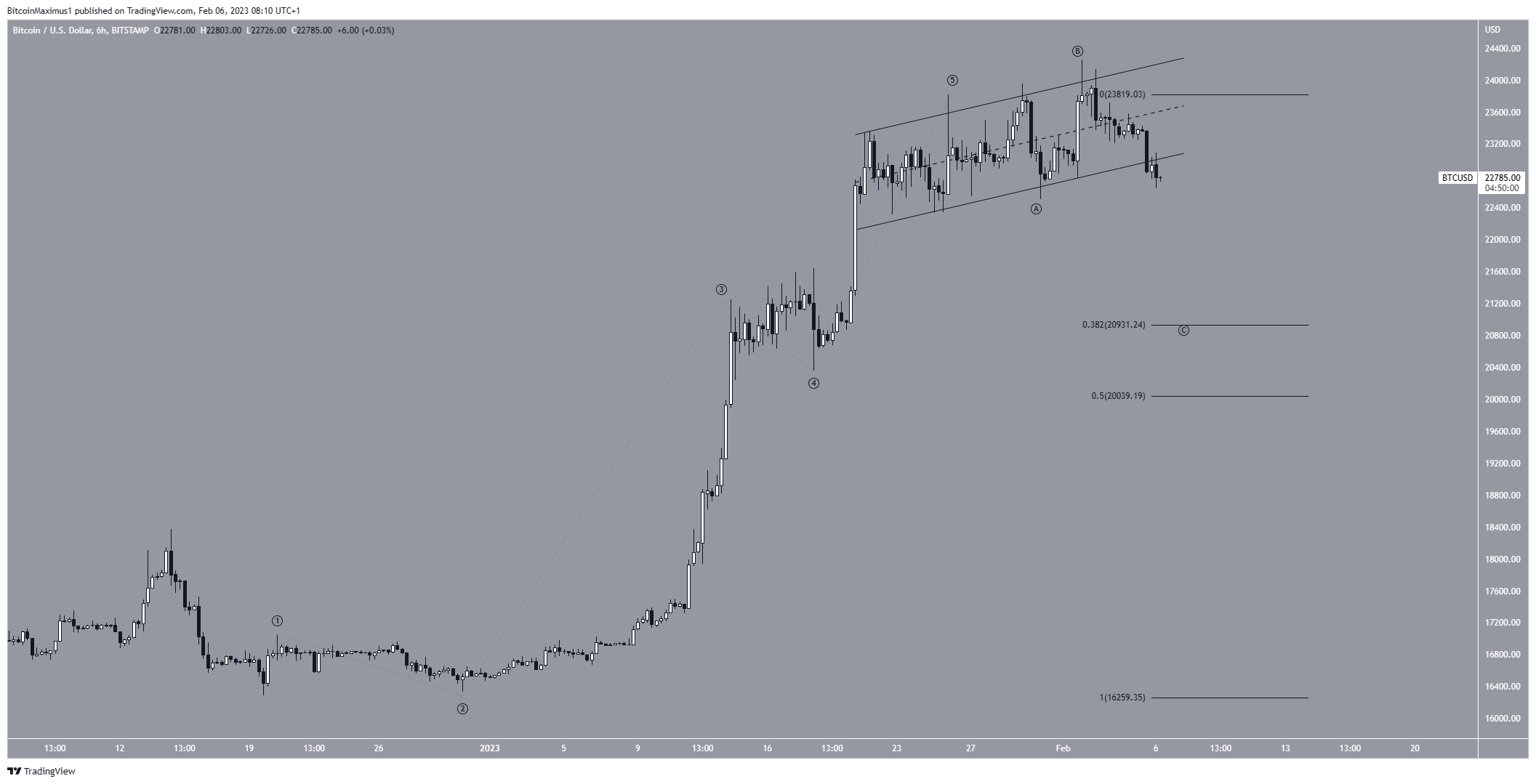 O preço do Bitcoin está dentro de um canal paralelo de alta desde 23 de janeiro. Em 2 de fevereiro, foi rejeitado pela linha de resistência do canal após atingir a máxima de US$ 24.258. Quatro dias depois, o preço caiu abaixo desse padrão gráfico.