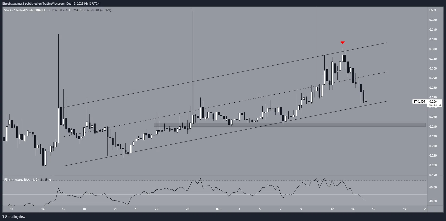 O preço da Stacks (STX) é negociado dentro de um canal paralelo ascendente desde 16 de novembro. A linha de resistência do canal rejeitou o preço no dia 13 de dezembro. Ele caiu para a linha de suporte do canal dois dias depois. A queda também foi combinada com um movimento do RSI abaixo de 50.