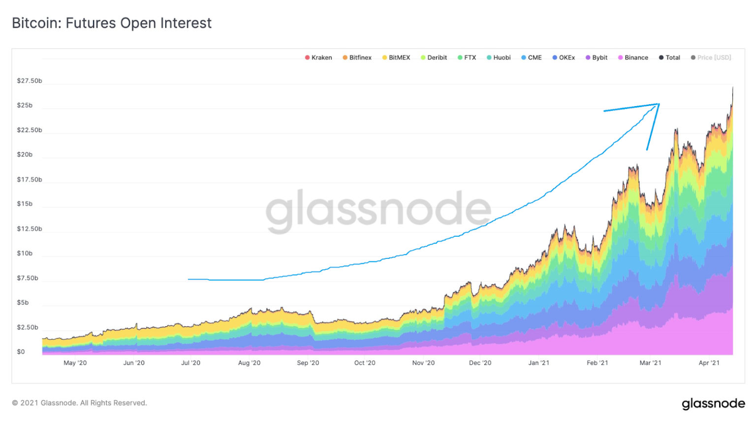 À medida que o preço do Bitcoin sobe, o valor dos contratos futuros também aumenta drasticamente, atingindo novamente o nível mais alto de todos os tempos. O gráfico da Glassnode mostra que o valor total dos juros em aberto de futuros nas principais bolsas de criptomoedas ultrapassou US$ 27 bilhões.