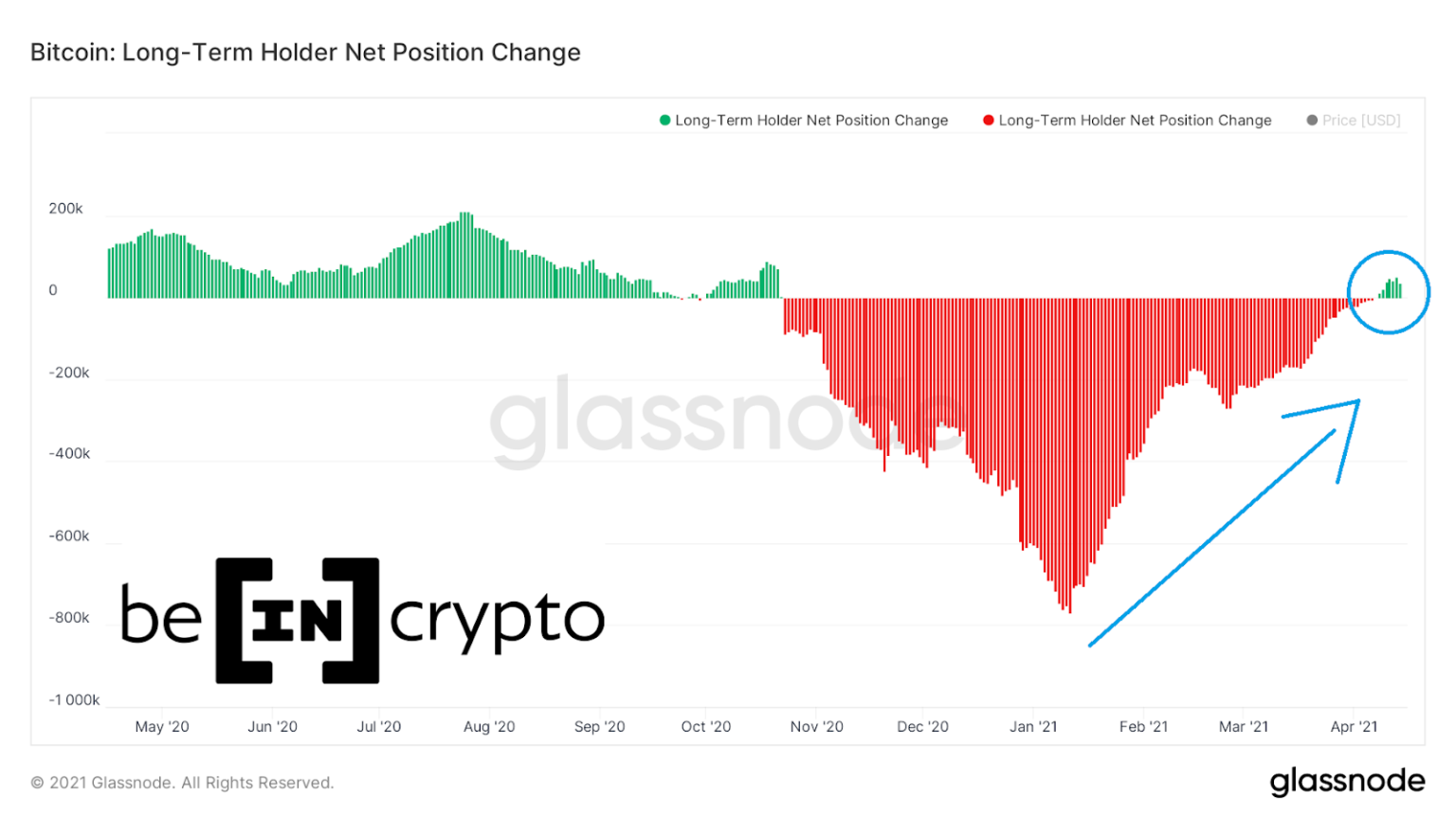 O primeiro indicador da análise on-chain que mostra uma mudança clara no comportamento dos investidores de longo prazo é o Mudança da Posição Líquida do Detentor de Longo Prazo (Long-Term Holder Net Position Change). Desde janeiro de 2020, houve uma queda significativa em sua atividade de vendas (seta azul).