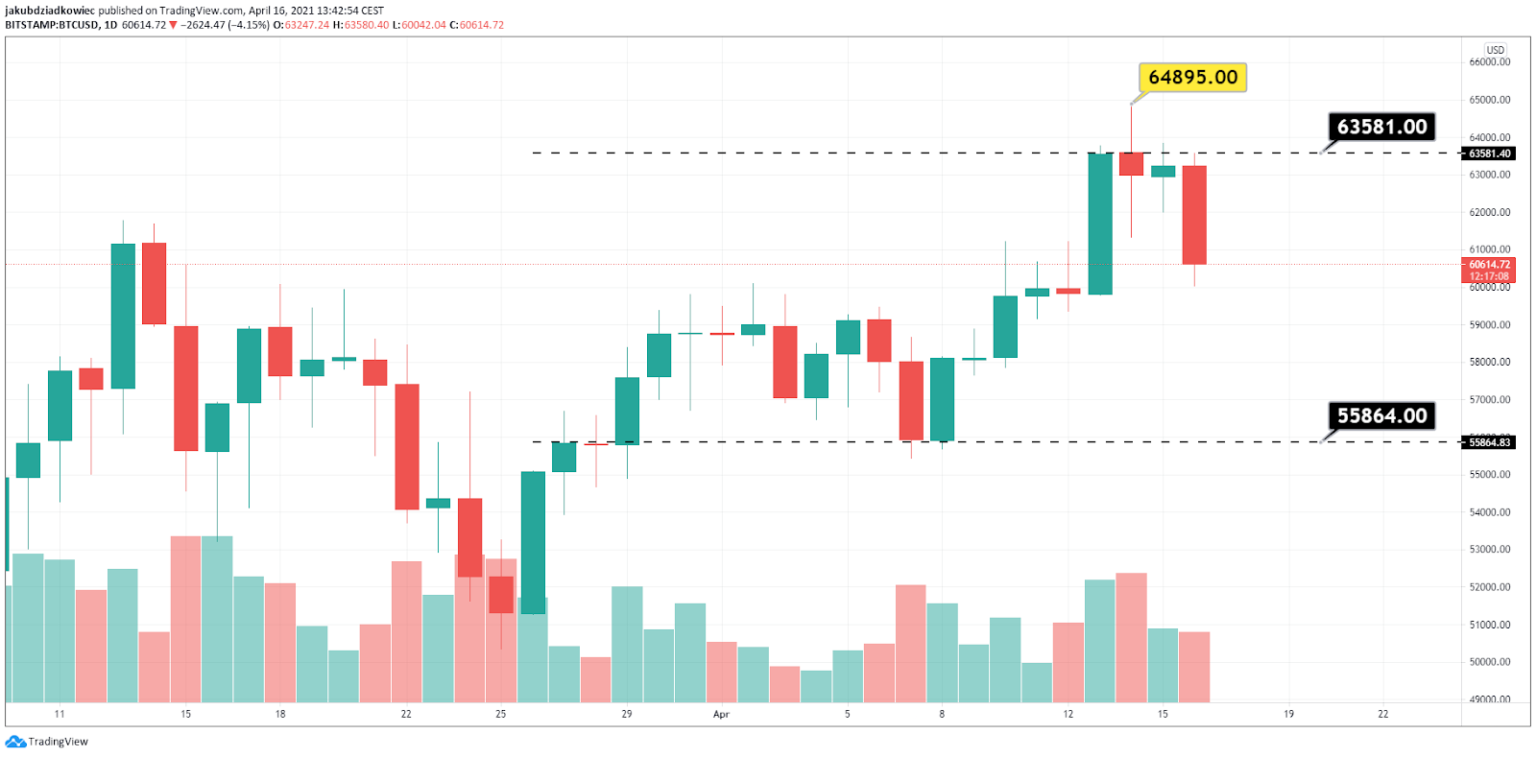 O Bitcoin atingiu um novo recorde histórico de US$ 64.895 em 14 de abril. Atualmente, ele está passando por uma correção, enquanto tenta validar a área de rompimento anterior como suporte.