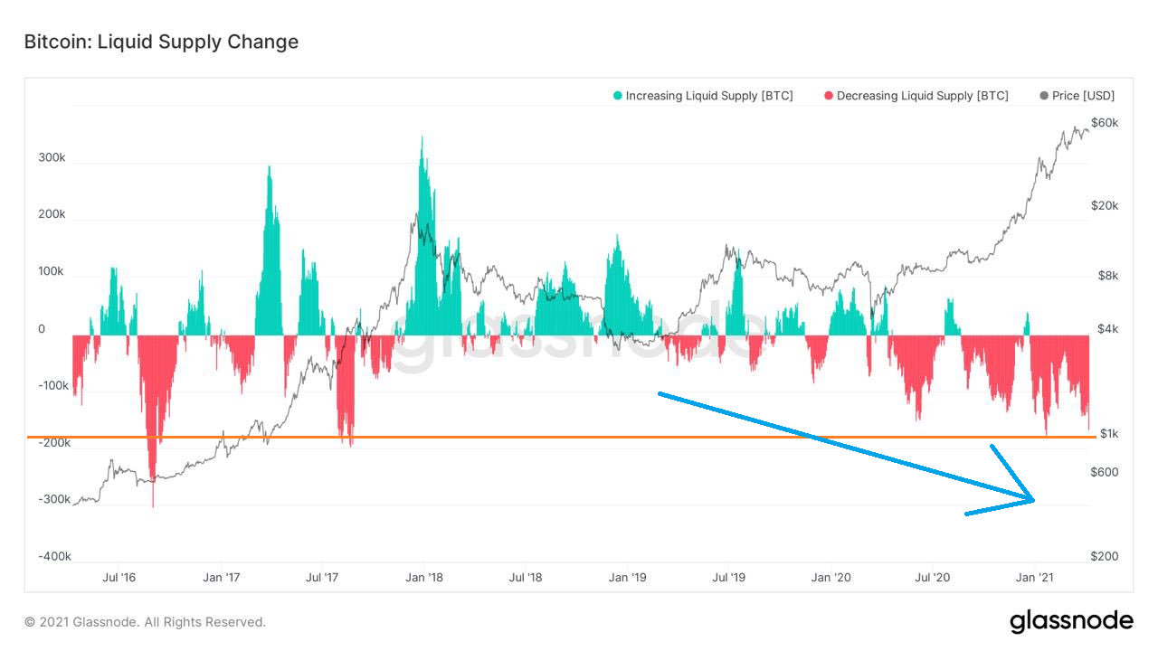 A confirmação dessa tendência pode ser encontrada em outro indicador de Bitcoin: Mudança de oferta de liquidez/iliquidez. A crise de liquidez da principal criptomoeda, que começou por volta de meados de 2019, está ganhando força e atualmente atinge novos máximos.