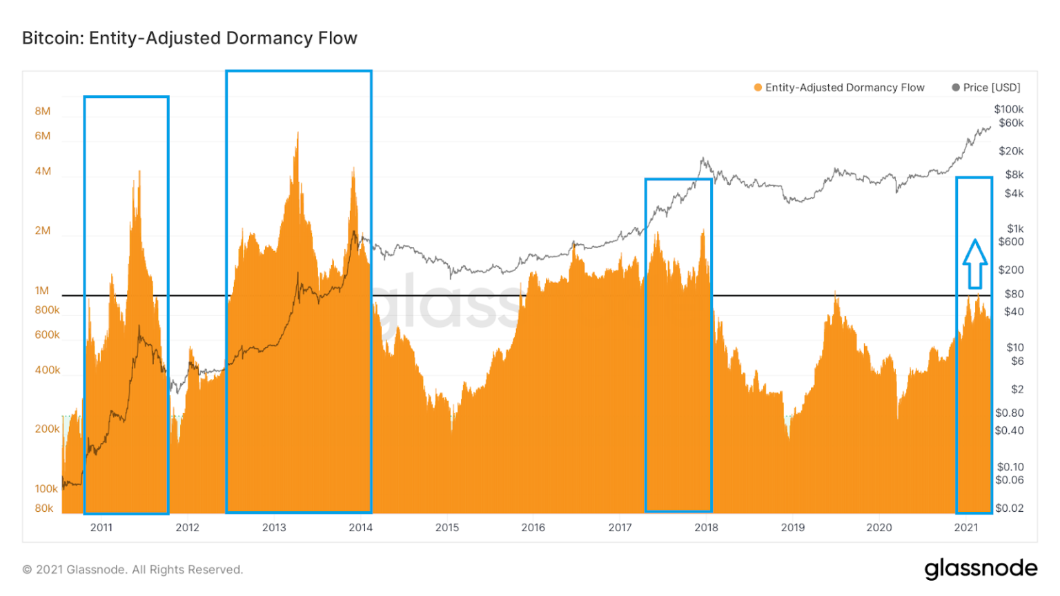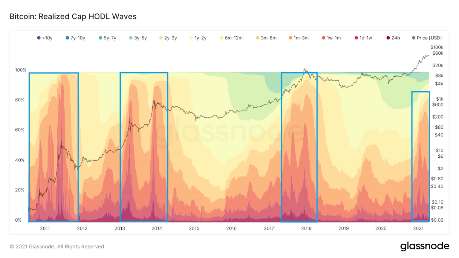 Abaixo, vemos um gráfico de ondas de acumulação ponderado por um limite realizado. Vemos máximos históricos para este indicador (retângulos azuis) que coincidem com os aumentos parabólicos de encerramento do mercado em alta no preço BTC.