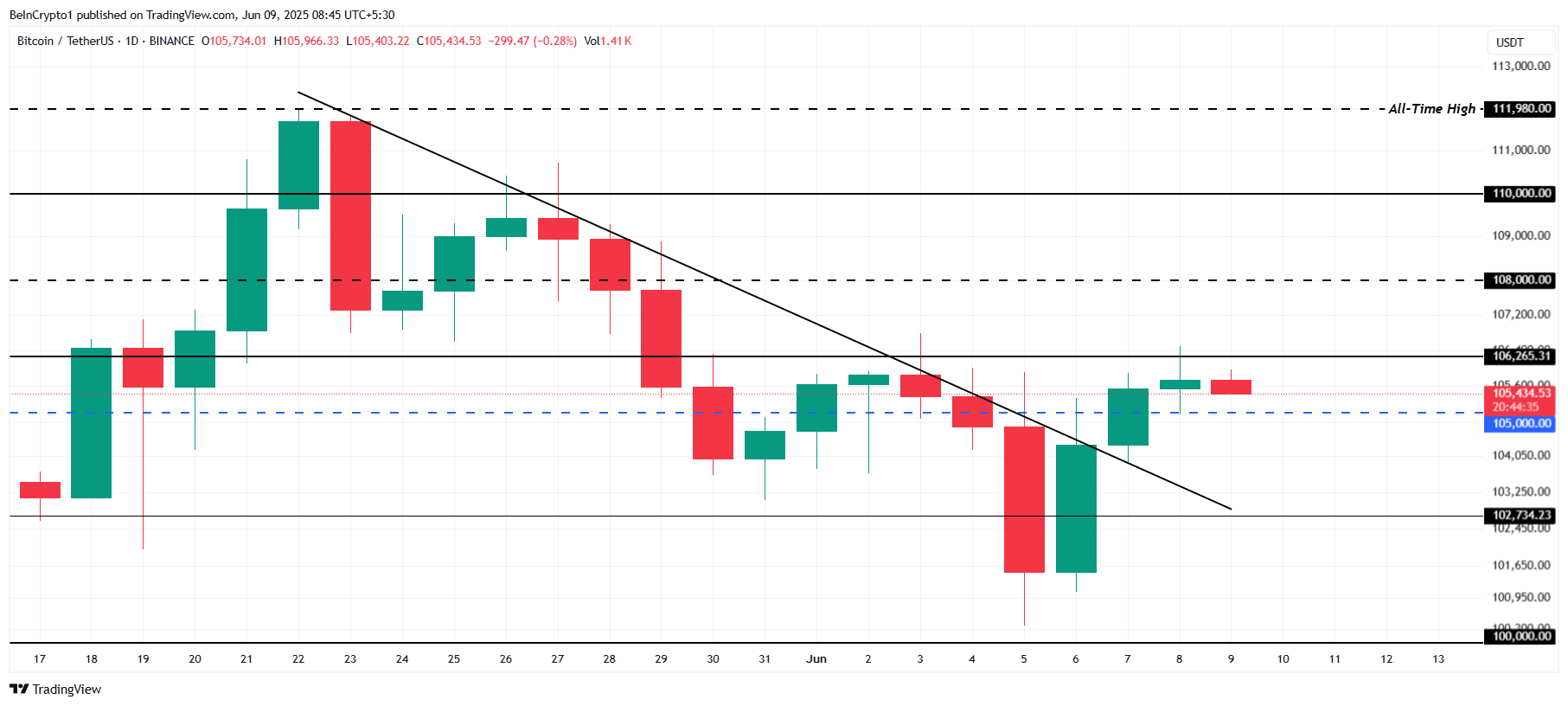 O Bitcoin está sendo negociado a US$ 107.700, permanecendo acima do suporte de US$ 105 mil após romper uma linha de tendência de baixa que durou duas semanas. Esse avanço indica uma possível reversão de momentum, com o BTC mostrando sinais de força após um período de pressão vendedora. O mercado segue atento aos próximos desdobramentos.