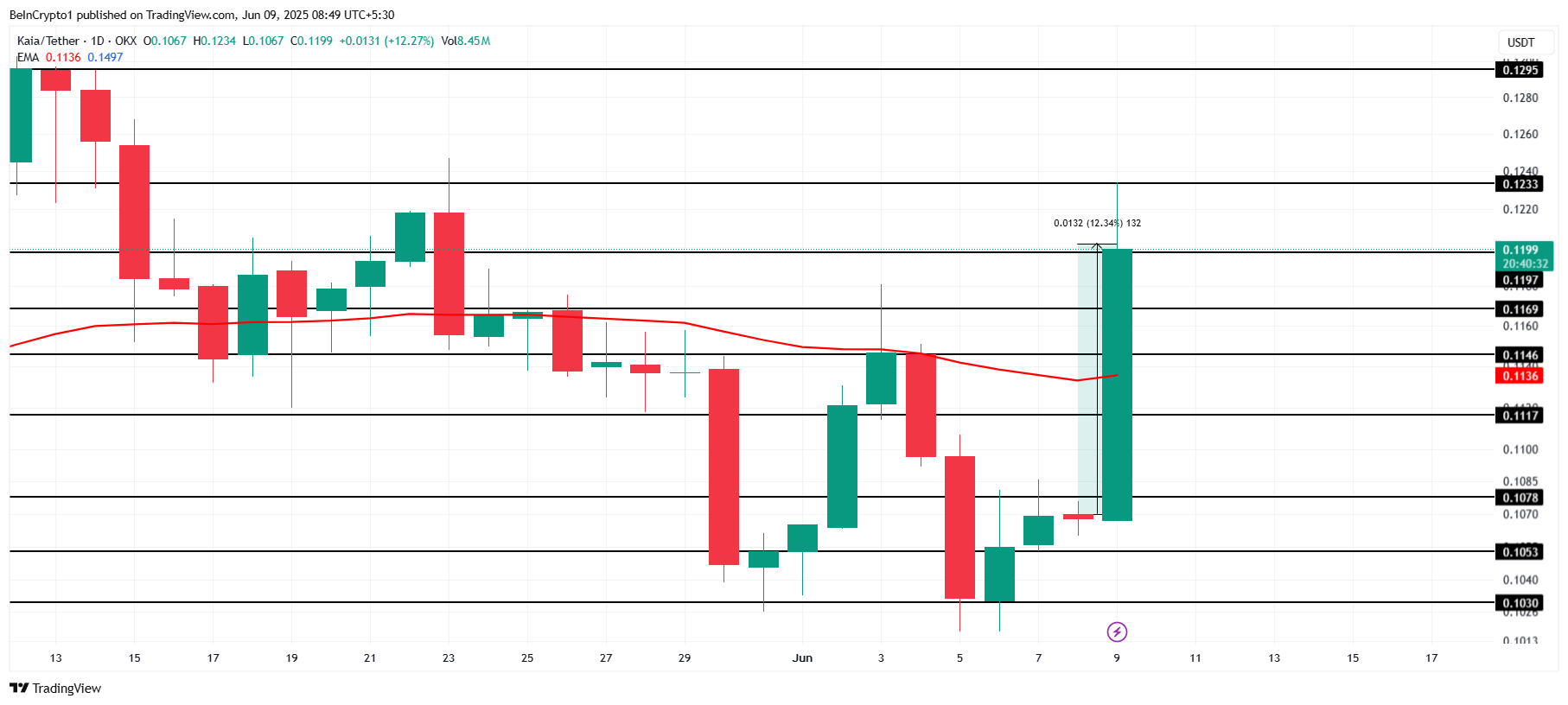 O preço da KAIA subiu 12% nas últimas 24 horas, liderando entre as altcoins no desempenho do dia. Negociada a US$ 0,1199, a moeda busca consolidar US$ 0,1197 como um suporte sólido. Esse nível será fundamental para sustentar seu impulso de valorização nos próximos dias.