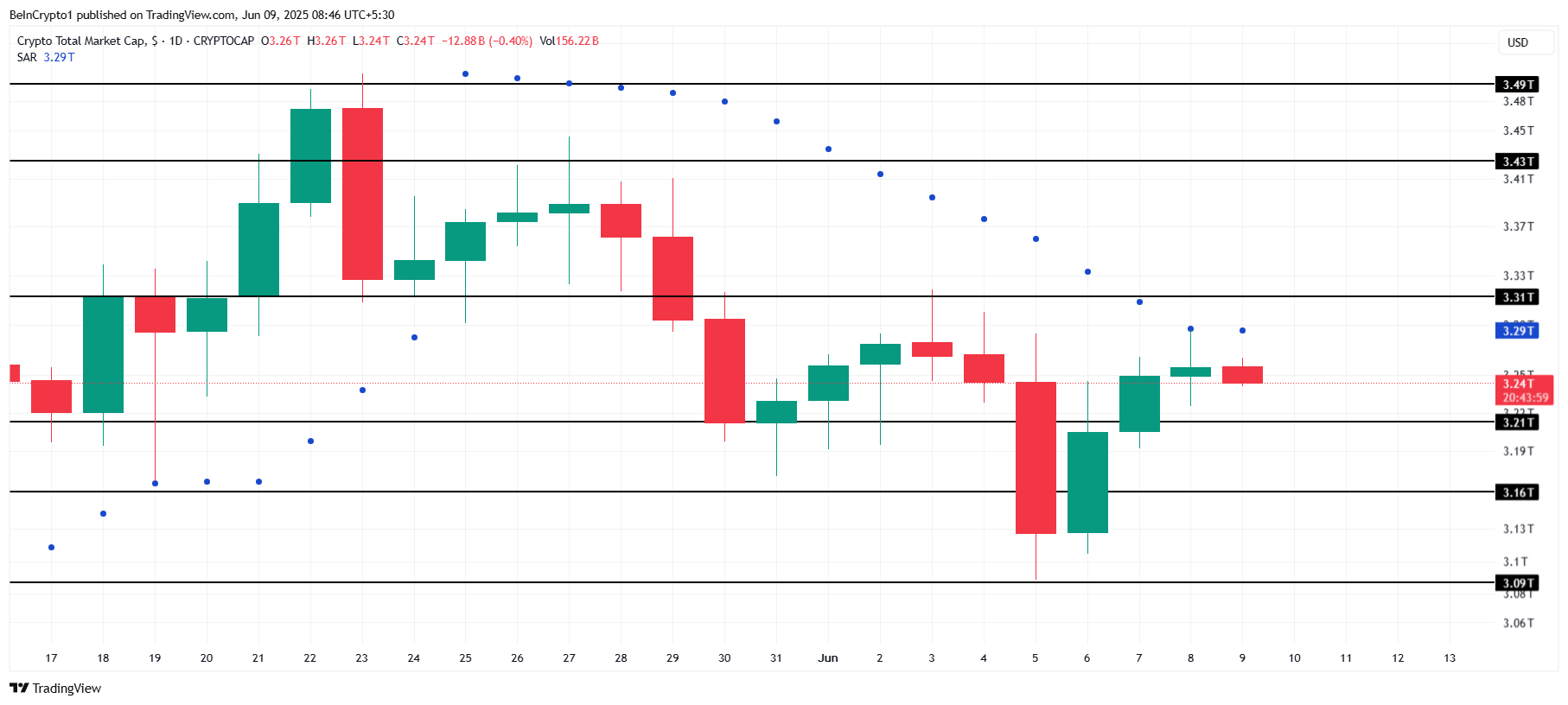 Se as condições macroeconômicas se deteriorarem, o TOTAL poderá entrar em tendência de baixa. Uma queda abaixo do suporte de US$ 3,21 trilhões pode desencadear perdas mais acentuadas, com o valor total do mercado possivelmente recuando até US$ 3,16 trilhões. Esse movimento pode abalar a confiança dos investidores e levar o setor cripto de volta a um ciclo de baixa.