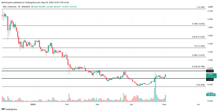 O volume de negociação de 24 horas da IMX disparou mais de 280%, atingindo US$ 146 milhões. Esse aumento no volume sugere um maior interesse dos investidores e uma forte participação do mercado na alta. Quando o preço e o volume de negociação de um ativo sobem simultaneamente, o movimento do preço é respaldado pela convicção.
