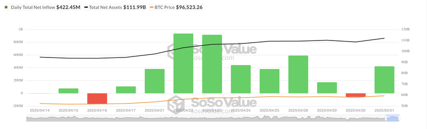 Ontem (1), a quebra da barreira psicológica de preço do BTC de US$ 95 mil levou investidores institucionais a investir capital em ETFs de Bitcoin à vista, totalizando US$ 422,45 milhões.