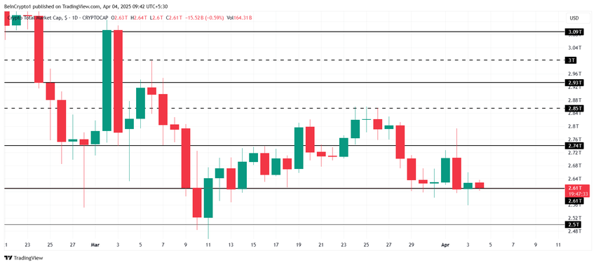 No entanto, se o suporte de US$ 2,61 trilhões falhar, o TOTALCAP pode recuar para US$ 2,50 trilhões. Abaixo desse nível, novas perdas podem ocorrer, levando os investidores de volta ao território negativo.