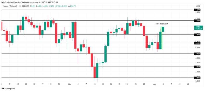 O preço do ATOM subiu 13,6% nas últimas 24 horas, sendo negociado a US$ 4,78, mas ainda está preso abaixo da resistência de US$ 4,95. Esse nível tem sido um obstáculo constante há mais de seis semanas. Os investidores acompanham atentamente para ver se o ATOM conseguirá finalmente romper esse patamar.