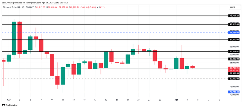 Por outro lado, se o Bitcoin perder o suporte de US$ 82.503, o preço pode cair para US$ 80 mil. Uma quebra abaixo desse nível psicológico pode indicar fraqueza, com possível queda até os US$ 76.741. Esse cenário aumentaria a pressão de venda e afetaria negativamente o sentimento do mercado.
