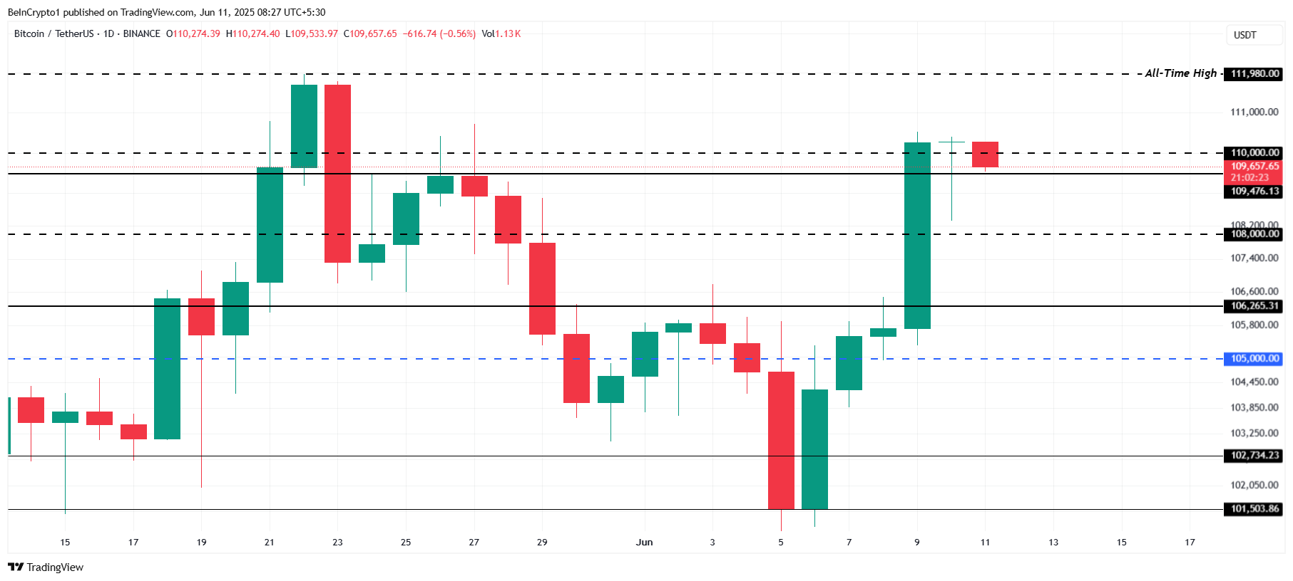 Caso o BTC se mantenha acima do suporte local de US$ 109.476, poderá alcançar uma nova máxima histórica acima de US$ 111.980. Esse avanço confirmaria a continuidade da tendência de alta e indicaria maior confiança entre os investidores. Sustentar esse suporte é essencial para preservar o impulso de valorização no curto prazo.