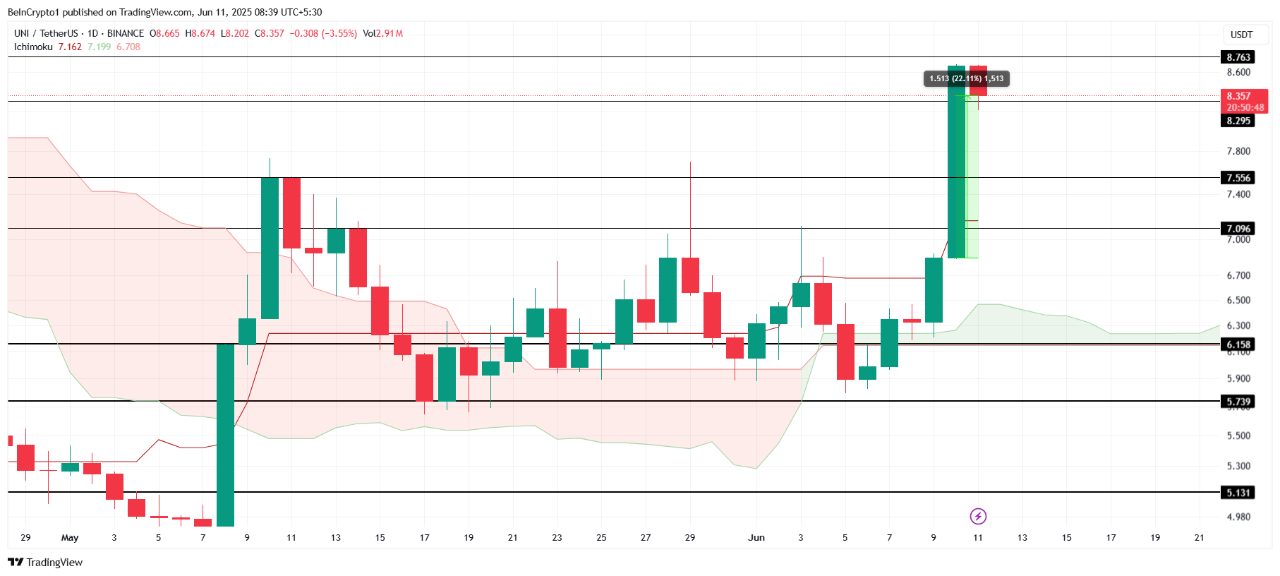 Negociada atualmente a US$ 8,35, a Uniswap busca consolidar o suporte em US$ 8,29. Caso consiga sustentar esse nível, a altcoin poderá romper a resistência de US$ 8,76. Garantir esse suporte é fundamental para manter o movimento de alta e abrir espaço para novas valorizações no curto prazo.