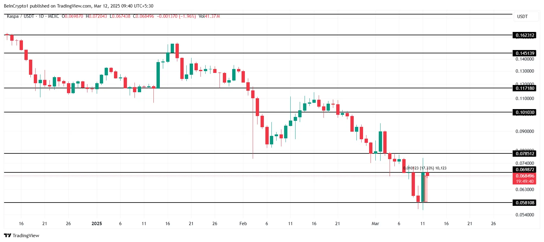 Kaspa (KAS) se destacou como a altcoin de melhor desempenho do dia, registrando um aumento de 17% nas últimas 24 horas. Atualmente sendo negociada a US$ 0,068, a altcoin busca ultrapassar e consolidar os US$ 0,069 como suporte. Esse movimento indicaria uma tendência de alta mais forte e maior potencial de valorização.