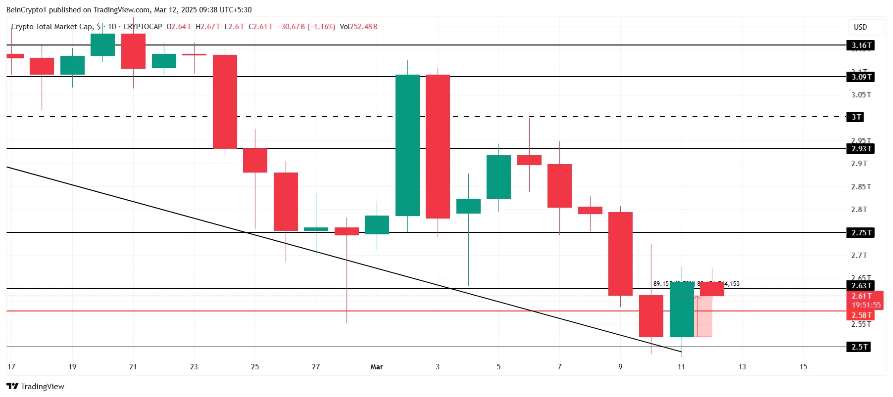 No entanto, se a TOTALCAP não conseguir consolidar o nível de suporte de US$ 2,63 trilhões, a capitalização do mercado pode recuar para US$ 2,50 trilhões. Isso reforçaria a perspectiva de baixa e indicaria novos desafios para o mercado cripto.