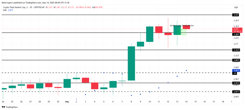 Se o sentimento dos investidores mudar devido ao atraso na movimentação do mercado, pode haver uma mudança para a venda. Isso pode empurrar o mercado de cripto para abaixo de US$ 3,28 trilhões.