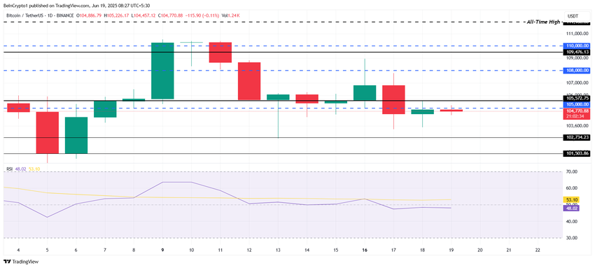 O Índice de Força Relativa ( RSI ) está atualmente ligeiramente abaixo da marca neutra, indicando que o momentum de baixa ainda persiste. Embora isso sugira que o Bitcoin possa enfrentar pressão de baixa, ultrapassar a resistência de US$ 105 mil pode mudar o momentum. Se o BTC se mantiver acima desse nível, pode mirar uma alta em direção a US$ 108 mil.