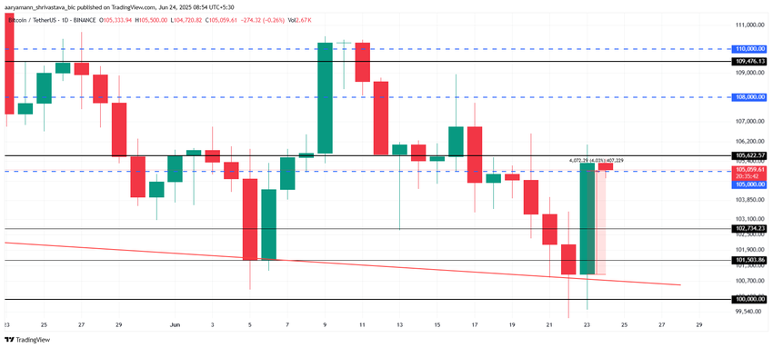 Por outro lado, se os detentores de curto prazo começarem a vender suas posições para garantir lucros, o Bitcoin poderá sofrer pressão de baixa. A incapacidade de se manter no nível de US$ 105 mil provavelmente levaria o Bitcoin de volta abaixo desse suporte, potencialmente caindo para US$ 102.734. Isso invalidaria a perspectiva otimista atual e sinalizaria uma reversão no sentimento do mercado.