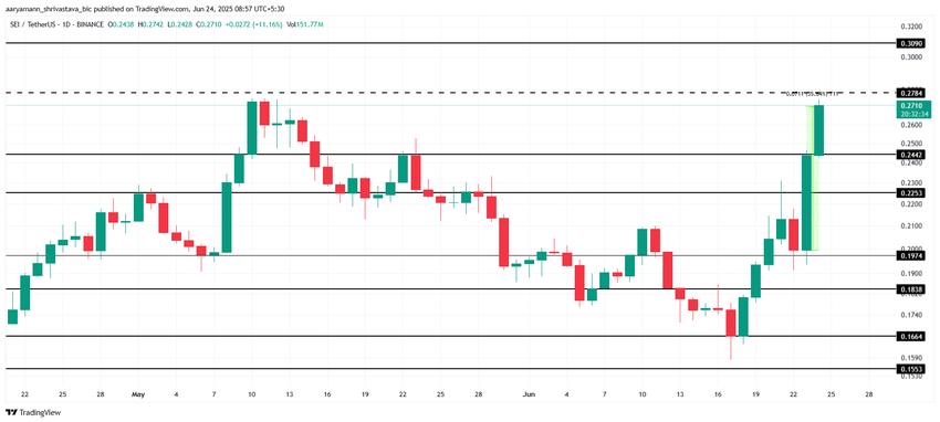 O preço da SEI subiu 35% nas últimas 24 horas, sendo negociada atualmente a US$ 0,271. Essa alta impressionante fez da altcoin o ativo com melhor desempenho do dia, atraindo a atenção de traders e investidores. O movimento de preço sugere um forte impulso e potencial para novos ganhos se a tendência continuar.