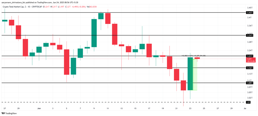 O valor total do mercado de criptomoedas teve um aumento substancial de US$ 142 bilhões nas últimas 24 horas, atingindo agora US$ 3,20 trilhões. O mercado está atualmente um pouco abaixo do nível de resistência de US$ 3,21 trilhões, após quase rompê-lo, sinalizando o potencial para um movimento de alta adicional se o impulso continuar.