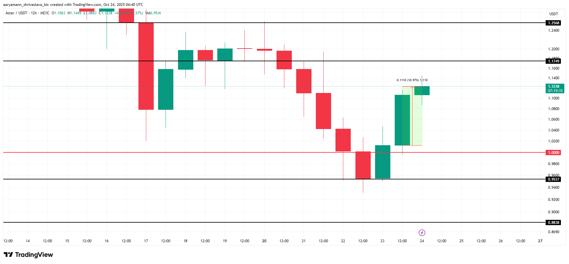 A Aster (ASTER) está sendo negociada a US$ 1,09 no momento da redação deste artigo, registrando um ganho impressionante de 7,4% nas últimas 24 horas. O impulso da altcoin indica a confiança renovada dos investidores, que se aproxima do nível de resistência de US$ 1,17.