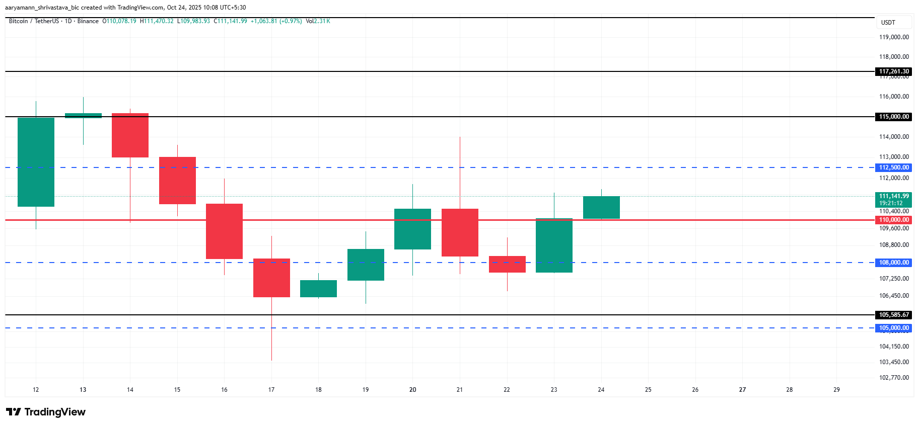 O Bitcoin está sendo negociado a US$ 111.192 no momento da redação desta análise, mantendo o suporte acima do nível crucial de US$ 110 mil. O gigante das criptomoedas está tentando se recuperar após a volatilidade recente, e um impulso sustentado será fundamental para confirmar essa recuperação no curto prazo.