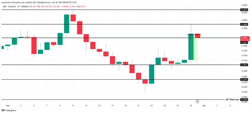 Atualmente, a ARB está sendo negociado a US$ 0,35, com este nível atuando como um forte suporte. Se o preço se recuperar deste suporte, a ARB pode subir em direção a US$ 0,38 e potencialmente ultrapassá-lo. O momentum positivo sugere que a altcoin pode registrar novos ganhos no curto prazo.