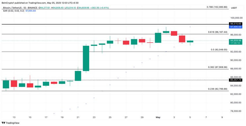 O preço do BTC tem apresentado tendência de queda desde que foi negociado brevemente a uma máxima intradiária de US$ 97.895 em 2 de maio. No momento em que este artigo foi escrito, a principal criptomoeda era negociada a US$ 94.659, testemunhando uma retração de 3% em seu valor nos últimos três dias.