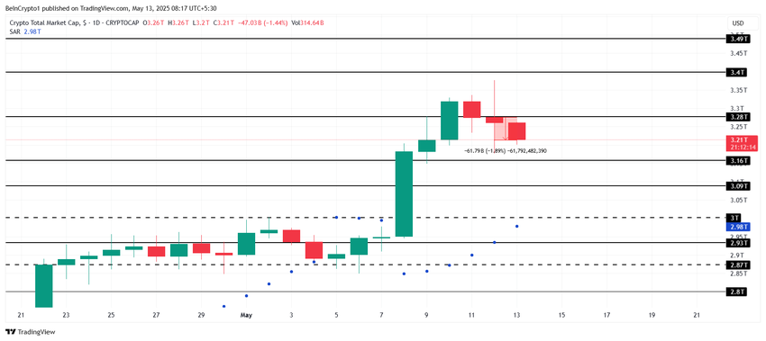 O valor total do mercado de criptomoedas caiu US$ 61 bilhões hoje (13), chegando a US$ 3,21 trilhões. Apesar dessa queda, como o indicador Parabolic SAR está atualmente abaixo dos candlesticks, o mercado pode se estabilizar e evitar perdas significativas, mas uma correção ainda pode ocorrer.