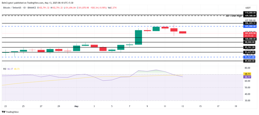O Índice de Força Relativa ( RSI ) recuou da zona de sobrecompra e agora está na zona de alta, sinalizando um momento positivo para o Bitcoin. Se essa tendência de alta continuar, o Bitcoin pode se recuperar do suporte de US$ 100 mil e avançar em direção a US$ 105 mil.