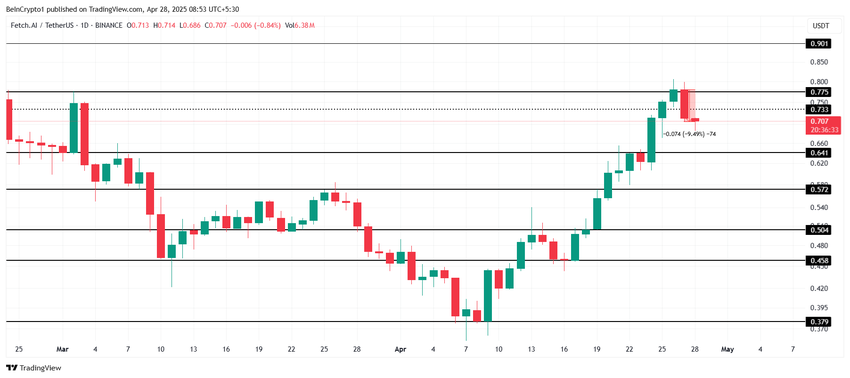 A FET evitou uma queda acentuada hoje, acumulando queda inferior a 10% nas últimas 24 horas. Atualmente negociada a US$ 0,707, a altcoin está passando por um período de recuperação após sua forte alta neste mês. Essa estabilização indica um otimismo cauteloso entre os investidores, apesar das flutuações mais amplas do mercado.