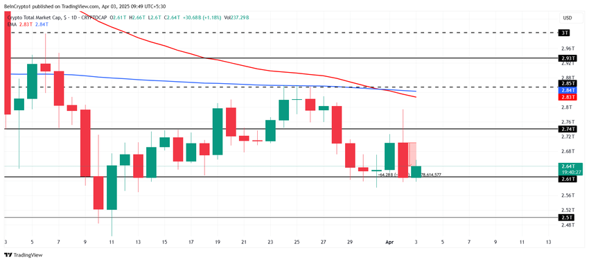 A capitalização total do mercado de criptomoedas (TOTALCAP) e o Bitcoin (BTC) sentiram o impacto das Tarifas do Dia da Libertação anunciadas pelo presidente dos EUA, Donald Trump. Curiosamente, o token OFFICIAL TRUMP (TRUMP) foi o pior desempenho do dia, com uma queda de 10%.