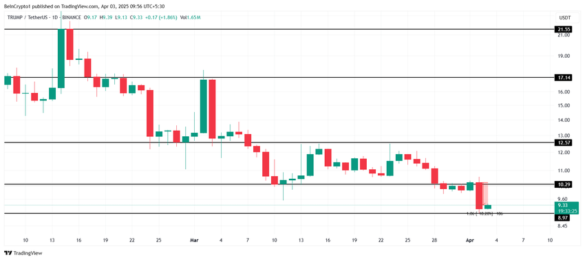 O token TRUMP caiu 10%, sendo negociado a US$ 9,33, mínima de 3 meses, chegando a tocar US$ 8,97 na mínima intradiária. O recuo reflete a reação dos investidores às novas tarifas anunciadas por Trump.