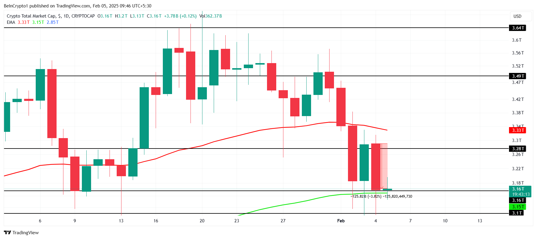 Atualmente, a capitalização total do mercado cripto está se mantendo acima do suporte de US$ 3,16 trilhões, auxiliada pela média móvel exponencial de 100 dias (EMA). No entanto, se a queda continuar, esses níveis de suporte podem ser rompidos. Esse cenário poderia levar o TOTALCAP a níveis mais baixos, potencialmente testando US$ 3,10 trilhões nos próximos dias.