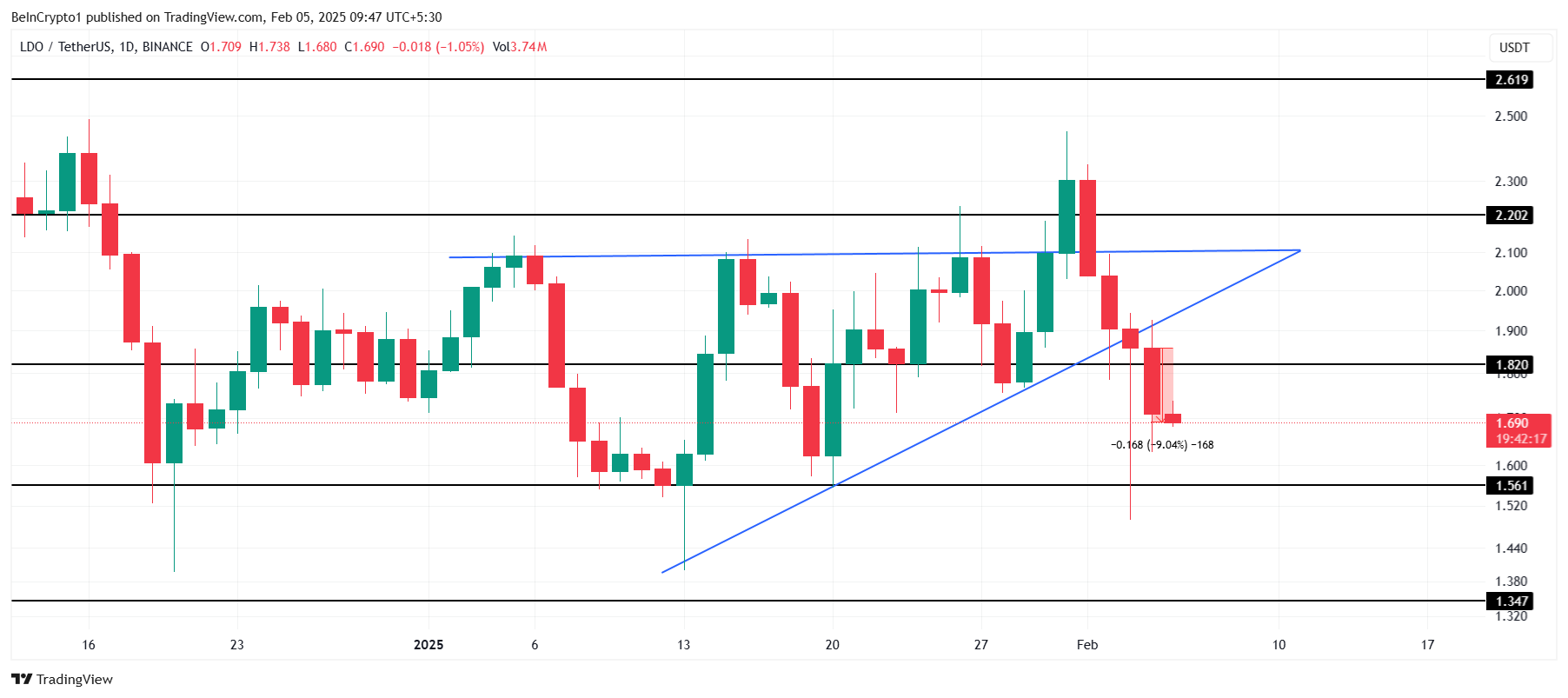 A queda no preço da LDO invalidou um padrão otimista de triângulo ascendente. A falha em romper essa formação deixou a altcoin vulnerável, com o próximo suporte esperado em torno de US$ 1,56. Se o momentum de baixa continuar, o preço pode cair ainda mais, aumentando a pressão vendedora.