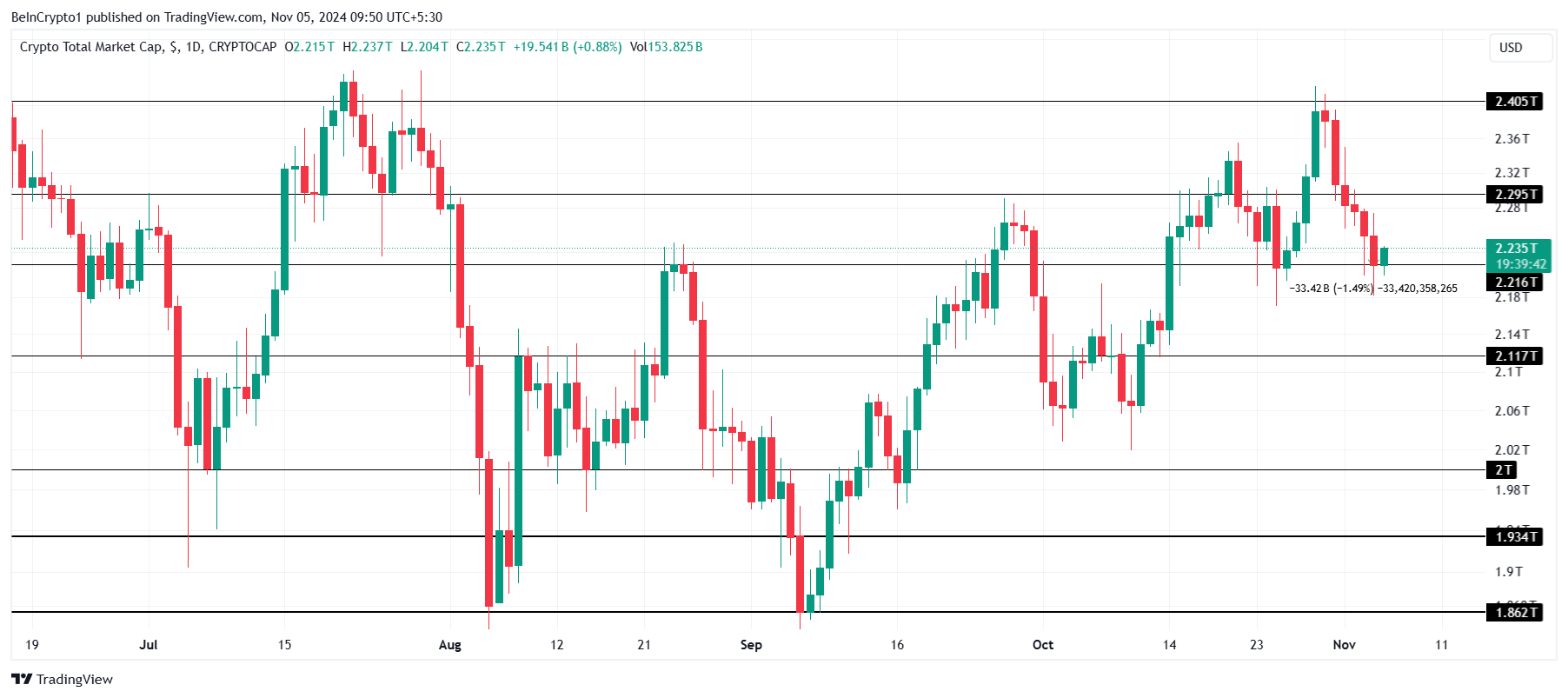 O valor total do mercado de criptomoedas caiu US$ 33 bilhões na segunda-feira, fixando-se em US$ 2,23 trilhões. Com isso, está se mantendo acima do nível de suporte crítico de US$ 2,21 trilhões, refletindo a pressão crescente dentro do mercado.