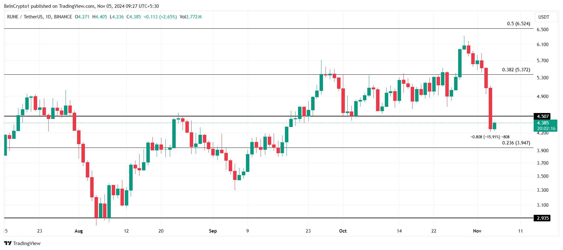 Mesmo que a RUNE não consiga romper US$ 4,50, ela pode evitar um declínio acentuado. A linha de retração de Fibonacci de 23,6% em US$ 3,94 serve como forte suporte, fornecendo um paredão contra perdas adicionais e um ponto potencial para recuperação.