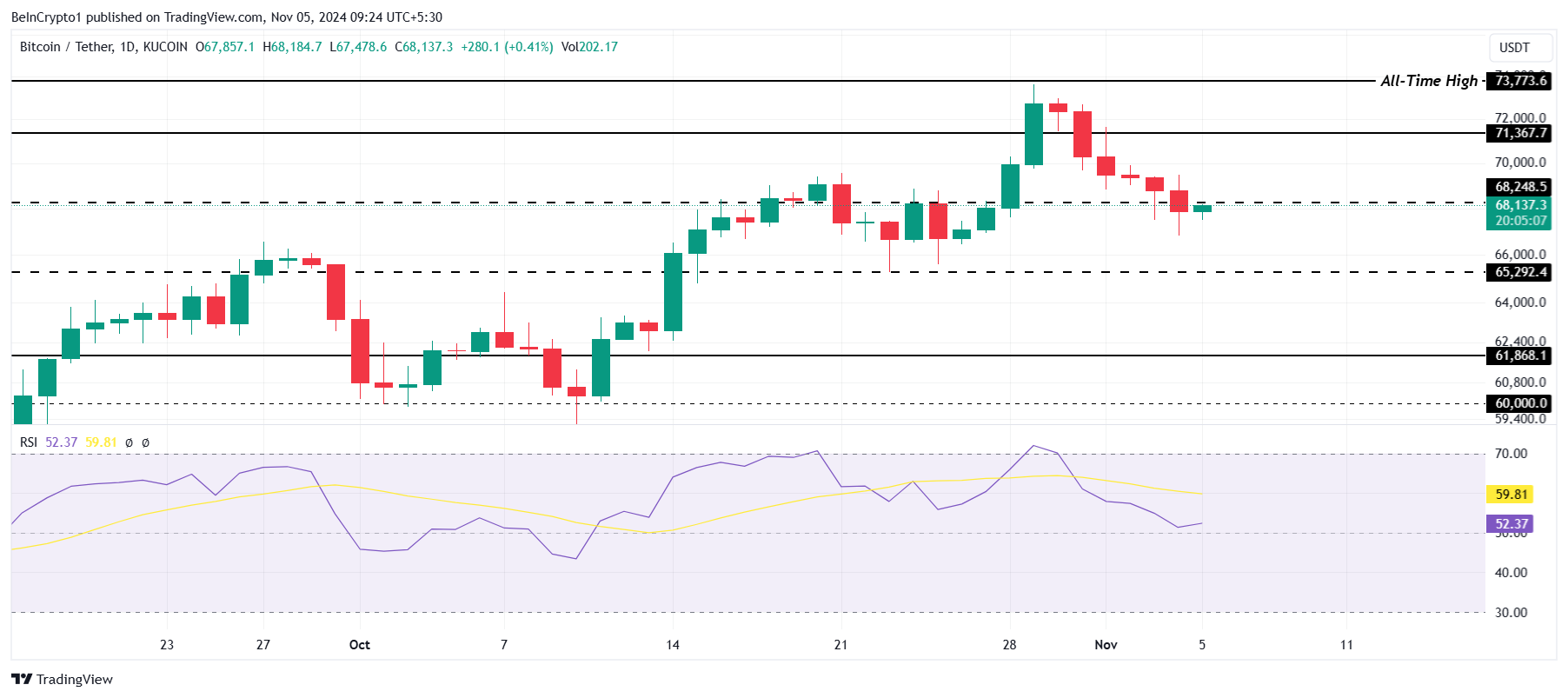 O Índice de Força Relativa (RSI) mostra atualmente que o momentum de baixa não se fortaleceu totalmente. No entanto, se a pressão de baixa se intensificar, o Bitcoin pode ver um declínio adicional em direção a US$ 65.292, sinalizando uma fase de consolidação mais prolongada para a criptomoeda.