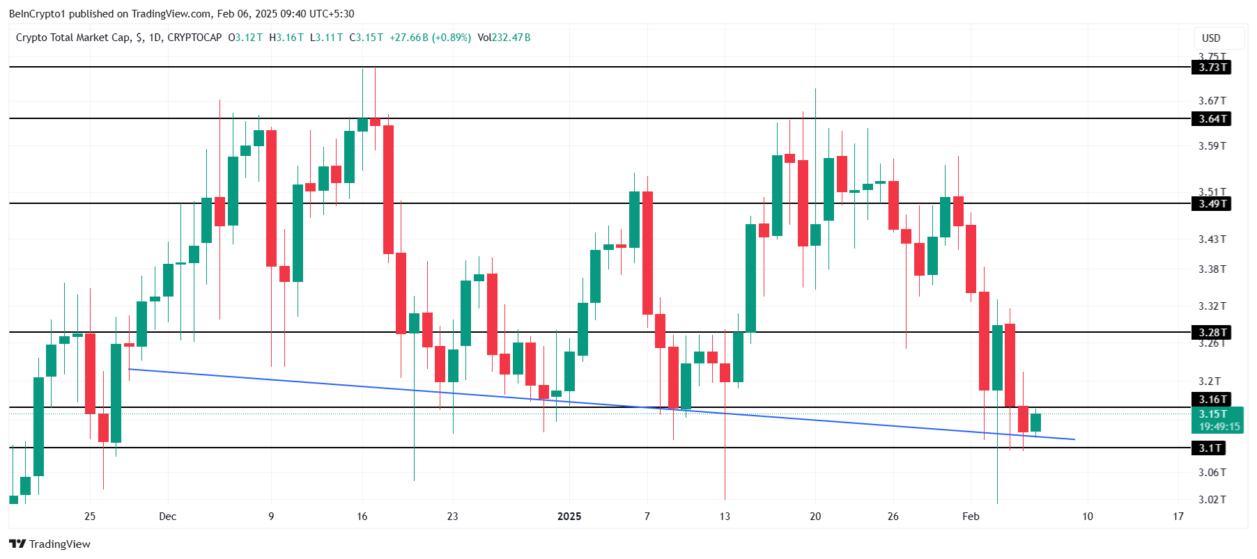 A capitalização total do mercado cripto caiu levemente nas últimas 24 horas, ficando em US$ 3,15 trilhões. Após perder o suporte de US$ 3,16 trilhões, o TOTALCAP testou o suporte de US$ 3,10 trilhões durante as mínimas intradiárias.