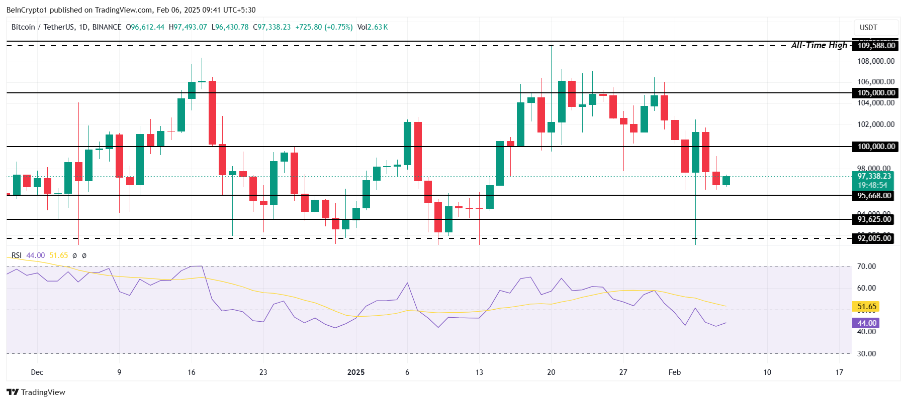 Atualmente sendo negociado a 97.338, o Bitcoin enfrenta o risco de cair para 93.625 caso o momentum de baixa se intensifique. O Índice de Força Relativa (RSI) indica um forte sentimento de baixa, tornando a recuperação mais desafiadora.