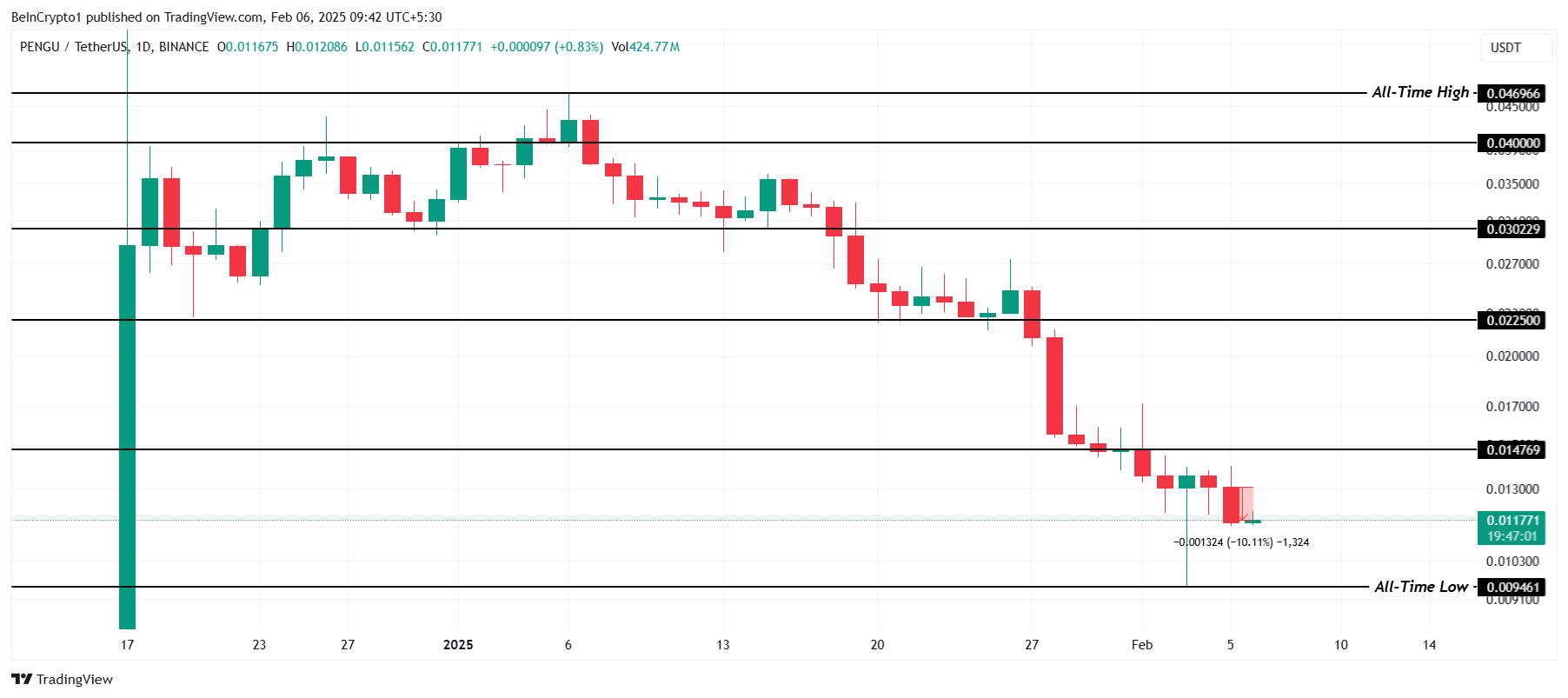 A PENGU caiu 11% nas últimas 24 horas, sendo negociada a 0,0117. A altcoin está se aproximando de sua mínima histórica de 0,0094, levantando preocupações entre os investidores. A volatilidade do mercado e o sentimento de baixa estão contribuindo para a queda.