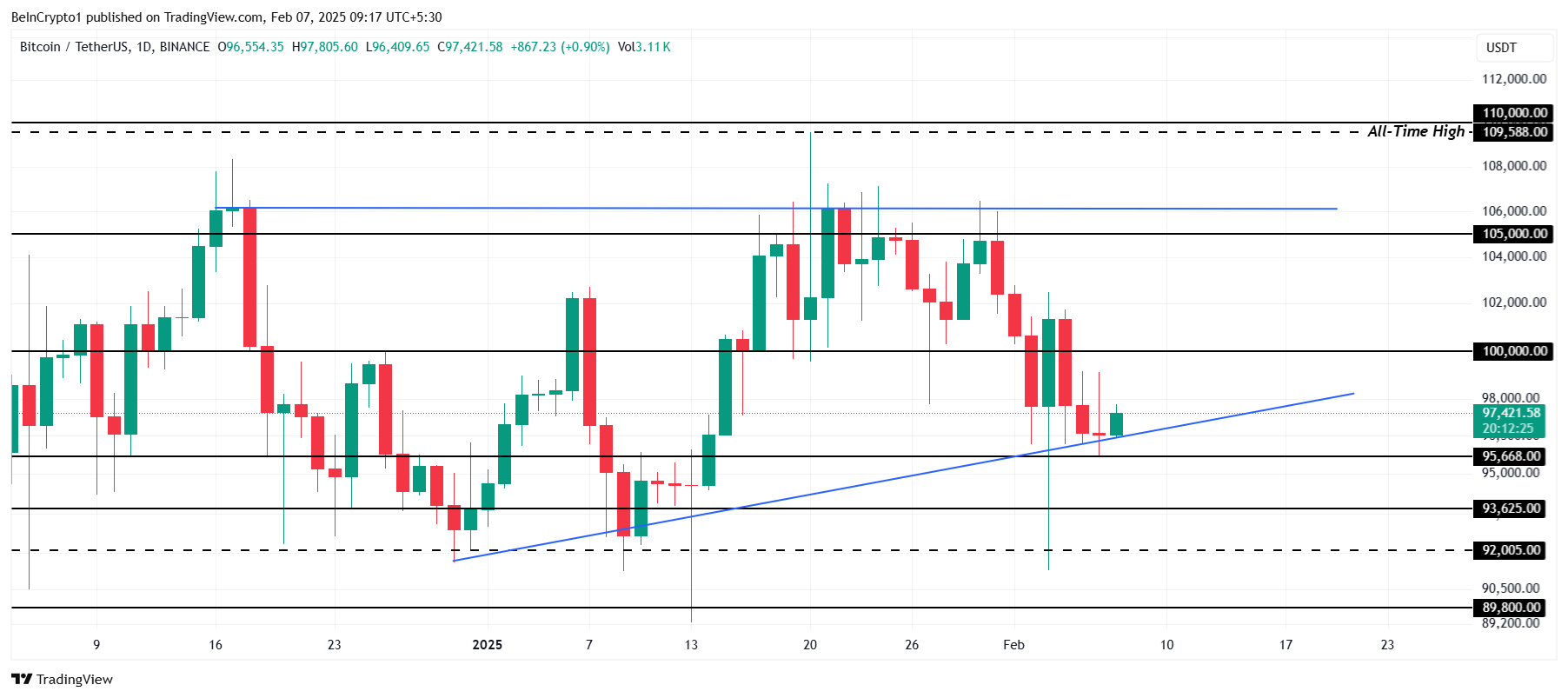 No entanto, a criptomoeda ainda está vulnerável a correções. Uma queda abaixo de US$97 mil pode expô-la a um recuo para US$95.668, potencialmente enfraquecendo o sentimento dos investidores no curto prazo.