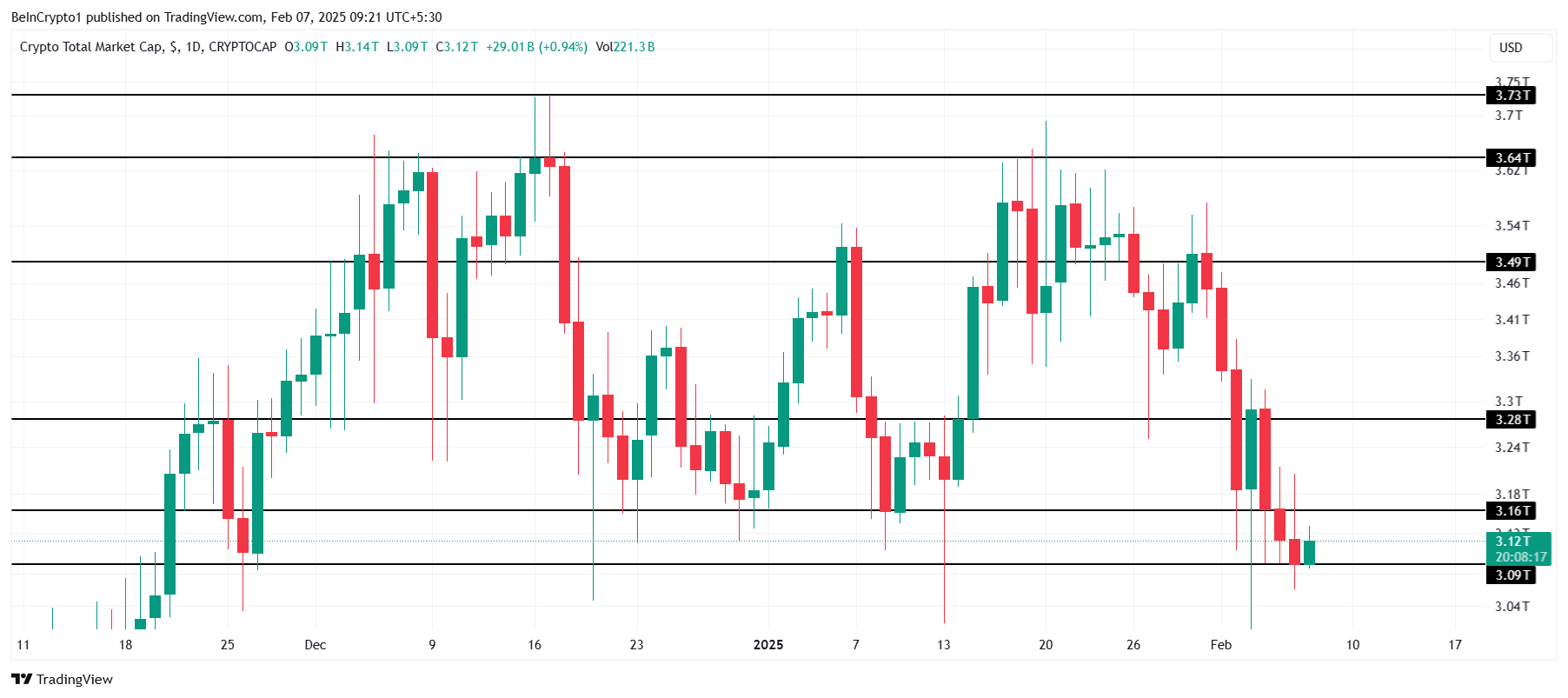 Apesar de neutralizar as perdas nas últimas 24 horas, a capitalização total do mercado ainda não conseguiu romper a resistência de US$3,16 trilhões. Esse nível continua sendo uma barreira crucial para um crescimento maior. Se o mercado não conseguir ultrapassá-lo, pode entrar em consolidação abaixo desse limite, atrasando um possível momentum de alta no curto prazo.