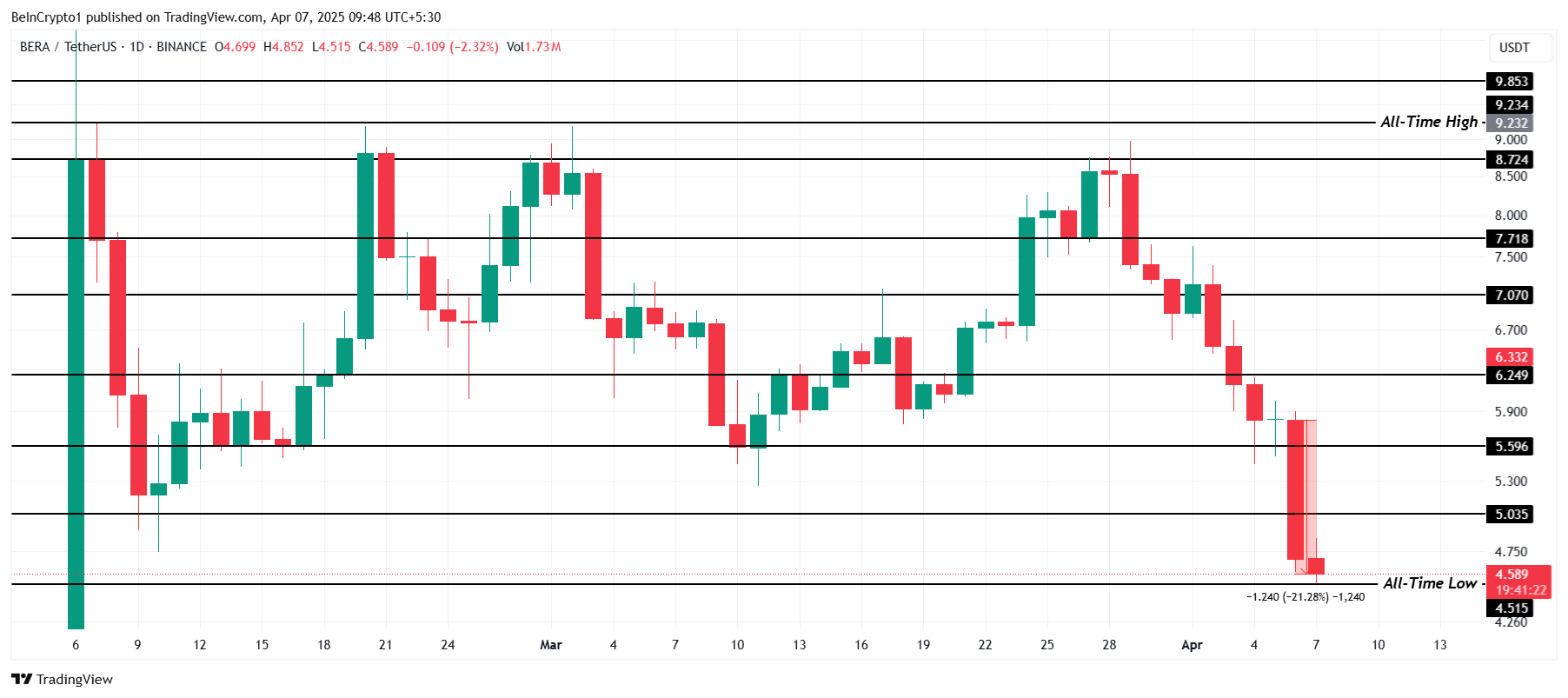 O token BERA da Berachain teve uma queda acentuada de 21% nas últimas 24 horas, sendo negociado a US$ 4,58. A altcoin chegou a um novo recorde de baixa de US$ 4,51 durante o dia, refletindo o sentimento negativo do mercado. A perspectiva de curto prazo para o token segue preocupante.